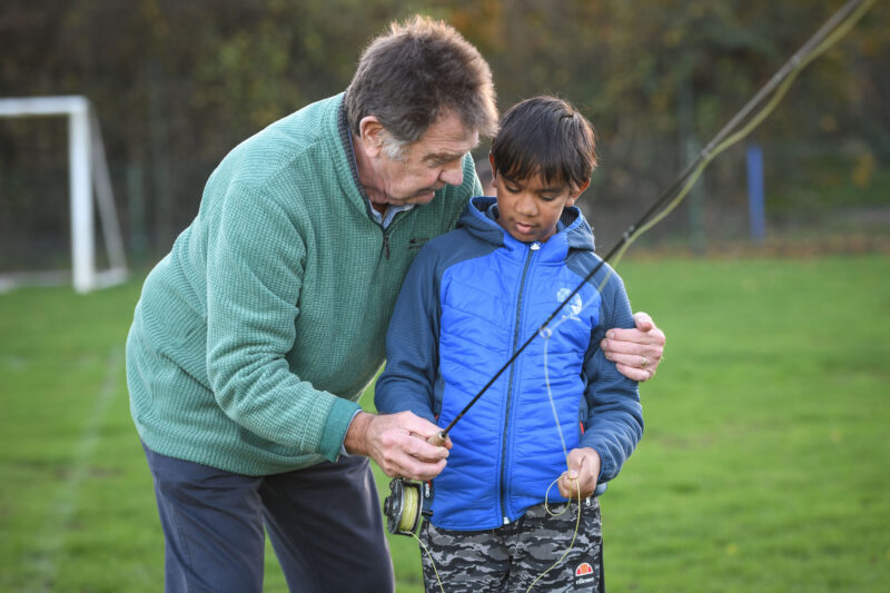 Steve Buck getting the line tugged on for the young lad to get the feel of a fish taking the fly.